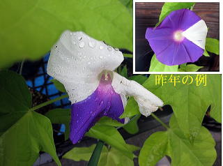 | 白と青混載花びら変化朝顔(昨夜の雨で乱れた | 花びらの芯が舌のような変化朝顔(昨夜の雨で乱れた) | |||||||||||