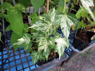 | 葉に白い斑点のある変化朝顔 | 葉がカールしたような変化朝顔 | |||||||||||
