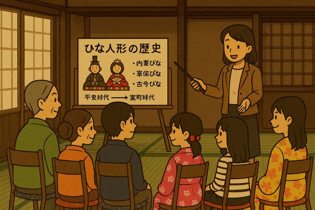 古民家の多数のひな人形に囲まれたあたたかな空間で、ひな人形の歴史と種類等を、ひな人形愛好家の先生がやさしく解説します。お子さまからご年配の方まで、ひな人形に込められた想いを楽しく学んでいただけると思います。