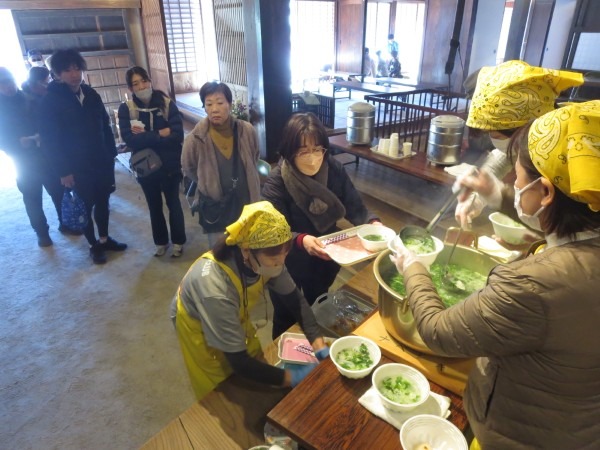 令和8年の最初のイベント、七草粥と正月遊びのイベントが、1月10日(土)快晴のもとでおこなわれました。途中、寒風が吹き荒んでテントが吹き上がったり、古民家に枯れ葉がいっぱい吹き込んだり、天気に翻弄された面もありましたが、中庭も古民家もどこもかしこも大勢の笑顔でいっぱいの一日でした。来場された皆様、今年も本郷ふじやま公園をごひいきにお願いします。ボランティアの皆様、年初よりエンジン全開でお疲れ様でした。