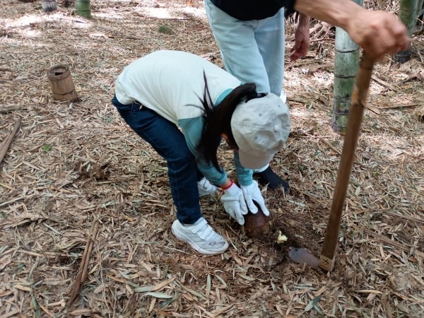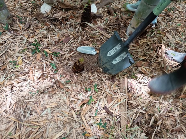 今年は「評判のわりに生育が遅い」と事前に聞かれていたため、収穫量に不安もありました。しかし実際に竹林へ入ってみると、タケノコはやや深い位置に潜っているものが多く、参加者はスコップを手に、かなり奥まで掘り進めながら丁寧に探し出していきました。