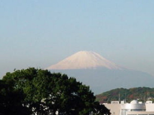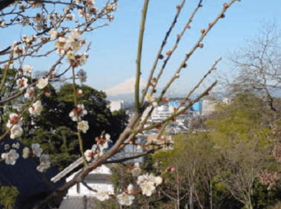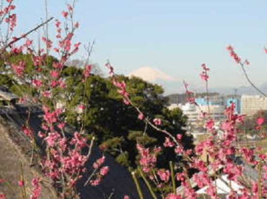 早春から上品な梅の花の香りがただよい、古民家の茅葺屋根の向こうに、雪をいただいた富士山を望むことができます。
