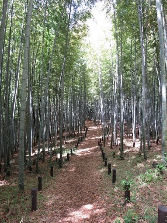 公園の南側に位置し、弓道場からふじやまの頂上に向かって続く園路沿いに、緑豊かな竹林が広がっています。