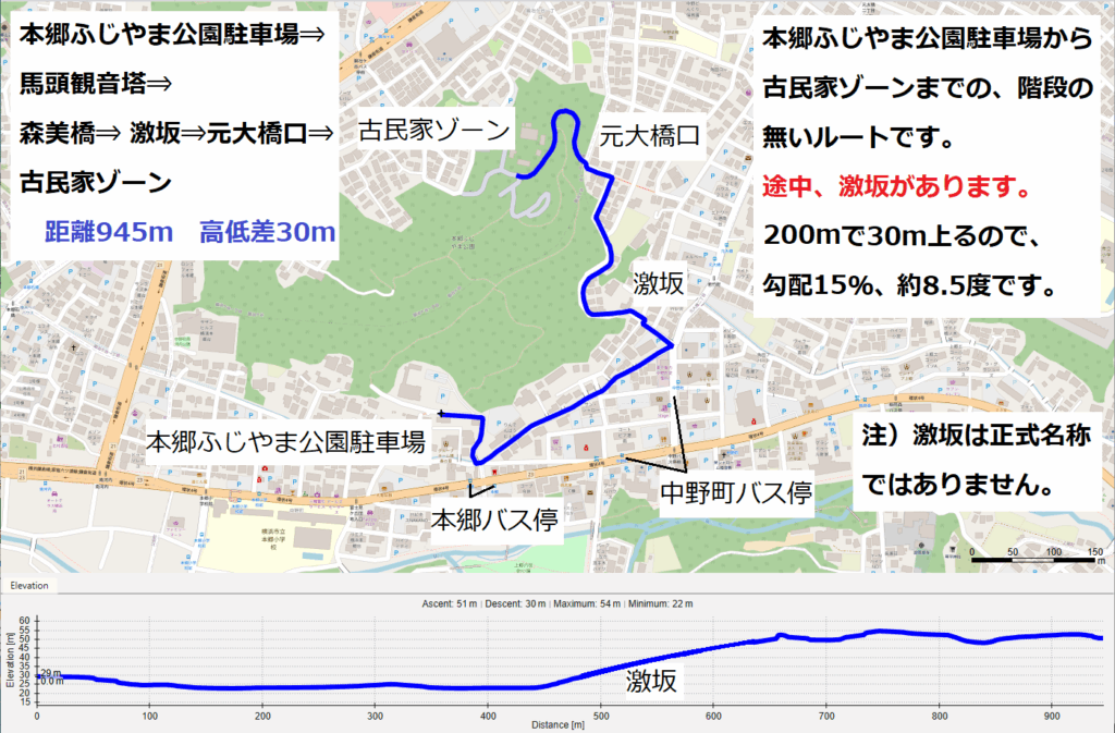 ◎鍛冶ケ谷口経由のルートには、約20mの上り坂があります。
