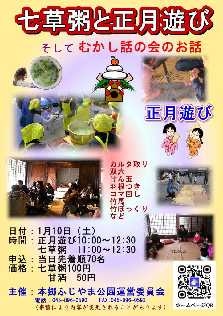 はまかぜ12月号に掲載されましたとおり、2026年1月10日(土)10時から、七草がゆと正月遊びの年始イベントが開催されます。コマ回しや羽根つき・かるたに加え、竹馬・竹とんぼなどの昔遊びも体験できますので、ぜひ遊びに来て下さい。